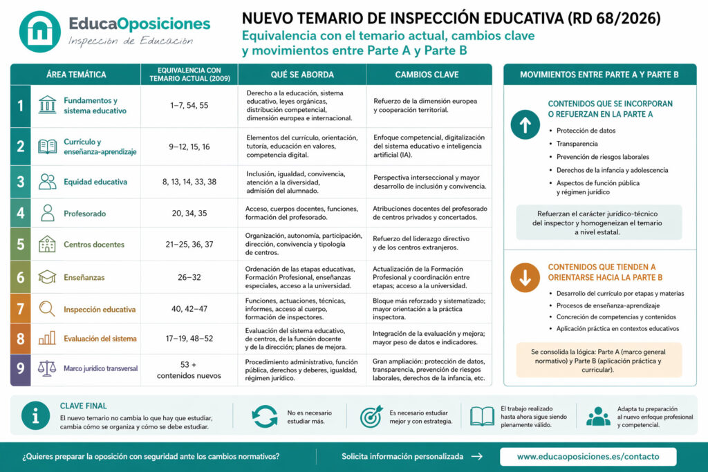 En las últimas semanas ha comenzado a circular el borrador del nuevo temario de acceso al Cuerpo de Inspectores de Educación, vinculado al Real Decreto 68/2026, de 4 de febrero. Su análisis comparado con el temario vigente (Orden EDU/3429/2009, de 11 de diciembre) permite responder con bastante precisión a la duda que muchos opositores se están planteando: